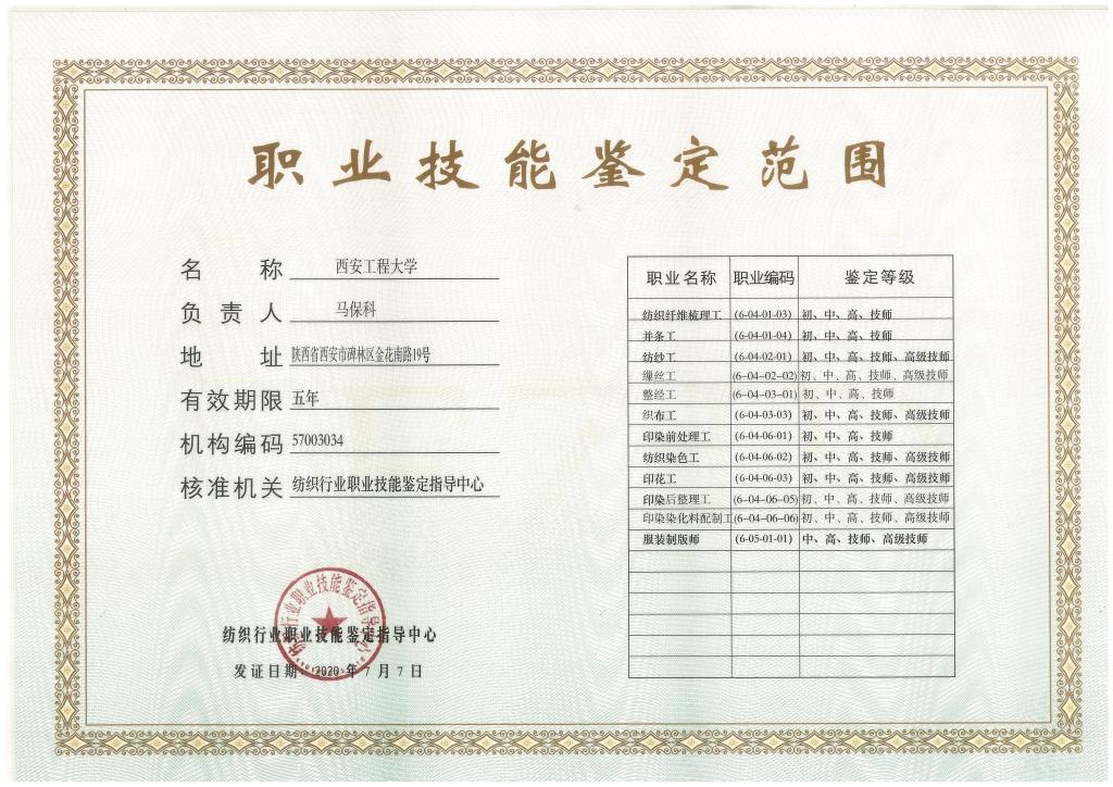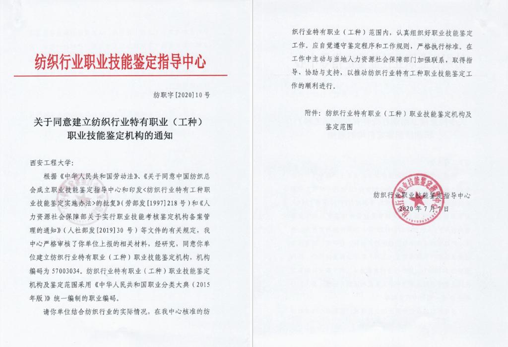 为切实加强beat365官网继续教育人才培养与劳动就业的联系,推进校企合作、产学研结合,充分发挥学校继续教育服务地方经济社会的职能,全面提升纺织行业从业人员的综合素质、职业能力和社会竞争力,根据纺织行业职业技能鉴定指导中心《关于申请设立纺织行业职业技能鉴定机构的通知》(纺职字〔2019〕15号)以及《人力资源和社会保障部关于实行职业技能考核鉴定机构备案管理的通知》(人社部〔2019〕30号)文件精神,beat365官网在充分调研的基础上,结合纺织服装行业的办学特色以及雄厚的师资力量,学校联合我省多家纺织企业,积极组织撰写申报材料,成功获批“纺织行业职业技能鉴定所”,开展陕西境内乃至西北地区纺织服装从业人员职业技能鉴定的组织、考试和协调管理工作。