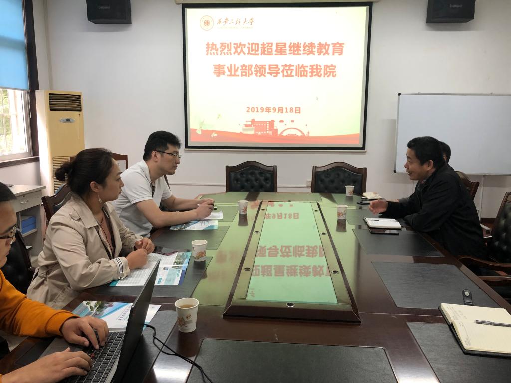 2019年9月18日下午,北京超星公司继续教育事业部副总经理马文华一行三人来beat365官网商谈继续教育合作相关事宜。双方的合作交流座谈在学院会议室召开,学院副院长刘玉森、学院培训部、成人招生负责人等参加了此次座谈,座谈由刘玉森主持。